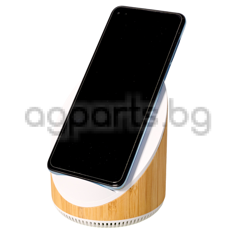 Elegant bamboo speaker with built-in 15W rapid wireless charger.