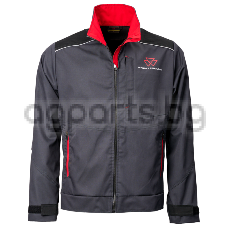 Dark grey work jacket for men: one zipped pocket on the chest, two zipped pockets on the front, one inside pocket closed with velcro, hem and cuffs adjustable with velcro, reflective stripes on the shoulders and in the back.